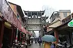 During the late Qing, Zhangzhou remained a center of silk, brick, and sugar production with about a million people and extensive internal and maritime trade. Its city wall had a circumference of about 4.5 miles (7.2 km) but included a good deal of open ground and farmland. Its streets were paved with granite but badly maintained. The 800-foot (240 m) bridge across the Jiulong River consisted of wooden planks laid between 25 piles of stones at roughly equal intervals.[4] The port of Xiamen in an island at the mouth of the Jiulong principally functioned as a trading center for the produce and wares of Zhangzhou and its hinterland;[5] both suffered economically when Indian tea plantations cratered demand for Fujianese tea in the late 19th century.[12]