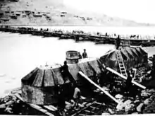 In 1372, general Feng Sheng was ordered to defend the remains of the Yuan dynasty west of the Yellow River, so he sent one of his commanders to build a pontoon bridge over the Yellow River seven li west of Lanzhou. In 1385, the pontoon bridge was moved below Baitashan near the city of Lanzhou, where the river flowed faster and the bridge would be easier to defend. The pontoon bridge would remain for another 524 years.[4] It was at this location that Zhongshan bridge would be built too.[5][6]
