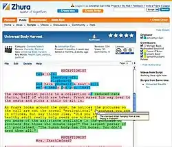 Zhura (/ˈzɜːrə/ ZUR-ə) is a free, web-based screenwriting software application for writing and formatting screenplays to the film industry standard, as well as other formats. Zhura allows users to collaborate on scripts in public or private groups and uses Creative Commons Licensing for all work in the public workspace.[1]