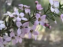 The flowers are pale to deep pink and are arranged in groups of mostly three, the groups usually longer than the leaves. The sepals are triangular, about 1.4 mm (0.06 in) long and usually smooth but hairy. The four petals are 4–5.5 mm (0.16–0.22 in) long, overlap at the edges and are covered with short, soft hairs and there are four stamens. Flowering occurs from late winter to early summer and is followed by the fruit which is a mostly glabrous follicle containing black seeds.[2][3][4]