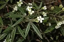 White to pale pink flowers, 10–13 mm (0.4–0.5 in) in diameter are arranged in clusters of between 3 and 21 in leaf axils. The clusters are about the same length as the leaves. The sepals are triangular, about 4 mm (0.2 in) long and covered with soft hairs. The four petals are about 6 mm (0.2 in) long, overlap each other and have a layer of hairs on the outside and there are four stamens. Flowering occurs from October to December and although insects have been observed visiting the flowers they have not carried fertile pollen from this species and fruit has not been recorded.[2][3][4]