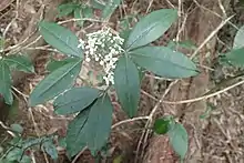 Zieria southwellii is a tall shrub or small tree which grows to a height of 5 m (20 ft). Its leaves are composed of three leaflets with the middle leaflet elliptic in shape, 45–90 mm (2–4 in) long, and 15–27 mm (0.6–1 in) wide with a rounded tip. The petiole is 18–35 mm (0.7–1 in) long and the upper surface of the leaf is more or less glabrous and the lower surface has oil glands. The flowers are arranged in large numbers in upper leaf axils, the groups usually shorter than the leaves. There are four triangular sepal lobes about 0.6 mm (0.02 in) long and four petals which are 4–5 mm (0.16–0.20 in) long, white and hairy. In common with other zierias, there are only four stamens. Flowering occurs from August to December and is followed by fruits which are mostly glabrous capsules dotted with oil glands.[1][2]