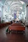 The town’s main church, the Parish of San Miguel, was the monastery church until the monastery church was closed during the Reform War. The church remained open but with non-monastic priests.[1] The structure dates from the 17th century, and has typical features for constructions from that time such as a cruciform plan, a central dome and an ornate two tier bell tower. Since it was Franciscan, the facade is a sober Baroque with minimal ornamentation. Inside, on the south wall is a stone pulpit decorated with carved scales. It also contains an unusual ceramic baptismal font which dates from the early colonial period. The rest of the church is fairly modern but colonial paintings and church furnishings from earlier periods can be found in the sacristy.[3]