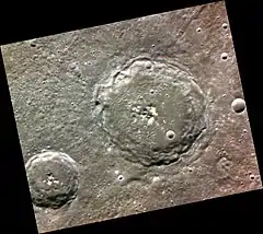 ![]() Mariner 10 image of Zola crater. Note the complex of peaks within the crater. North is up. | |
