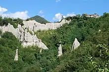Zone (Brescian: Sù) is a comune in the province of Brescia, in Lombardy, northern Italy. It is situated in a mountain valley east of Lake Iseo. The town is known for the nearby "Pyramids of Zone", formations of large rock pillars created by erosion. Its coat of arms shows three of these pillars.[3]