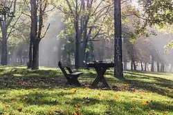 The forest is generally a crescent-shaped wooded area which today covers an area of 137 ha (340 acres), out of which 21 ha (52 acres) is arranged as a park.[6][2] There are many paths and proper streets, including the Volgina street which criss crosses the entire forest. The forest was partially expanded to alleviate the effect of the strong košava wind. while the extension on the southern slope, towards the hospital, prevents the possible mass wasting.[5][2] It creates a milder microclimate, conducts fresh air to the central urban tissue, prevents the erosion and creates a mass natural underground water reservoir. Also, it prevents the pollution from the industrial city of Pančevo on the east to reach the center of the city.[7]
