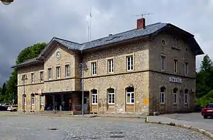 Zwiesel station is the most important railway hub in the Bavarian Forest. It is the only station of the Lower Bavarian town of Zwiesel. Apart from this station, the town also contains Lichtenthal station in the Zwiesel district of Lichtenthal. It is classified by Deutsche Bahn as a category 3 station[1] and has four platform tracks. Zwiesel is located on the railway between Plattling and Bayerisch Eisenstein/Železná Ruda-Alžbětín, also called the Bavarian Forest Railway (Bayerische Waldbahn). In Zwiesel station the lines to Grafenau and to Bodenmais branch off the Bavarian Forest Railway. The lines are maintained by DB Regio and the services are operated by Regentalbahn.