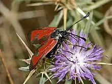 Z. erythrus Hbn. (= saportae Boisd.; minos Boisd.) (4a). Larger; antenna longer, with thicker club. The red colour of forewing restncted to 3 streaks , the distal one being wedge-shaped ; moreover, only the basal third of the hindmargin of forewing is red. South France, Italy and Sicily. In ab. irpina Zickert, from the Riviera, the cuneiform spots are confluent. — As magna [Seitz, [1907] ] (4 a) a very large form from the Abruzzi is sold by Staudinger; the posterior cuneiform spot is strongly widened and distally straight-truncate.— Larva dull greenish yellow, witli heavy black dots subdorsally and yellow side-spots (Sapokta); in some districts not distinguishable from the larva of purpuralis. On Eryngium and Thyme (Rouast). Hibernating; pupation at end of May. Imago in June and July; frequently sitting on Thyme and Eryngium.[6]