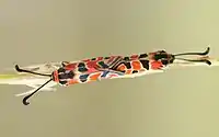 The caterpillar (larva) is dark grey with a black line above a line of white interrupted by yellow bands. The caterpillar's food plants are vetches of the genus Coronilla.[3]