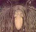 The trolls in Bauer's artwork appear to have a part running down the middle of their foreheads. To imitate that effect, select an appropriate yarn and cut a number of equal lengths to approximate the over-the-shoulders effect of Bauer's trolls. Then lay across the puppet head behind the ears and secure with tight backstitches. Trim ends of hair as appropriate.