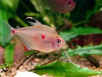 The bleeding heart tetra, Hyphessobrycon erythrostigma, is a peaceful midlevel-dwelling community fish in the aquarium. It grows to 64 mm long and lives about five years. It requires warm water (78°F or 26°C). This fish, like most tetras, needs soft, acid water, pH 6.5-6.8, with plenty of plants. This fish is somewhat susceptible to velvet disease and Ichthyophthirius multifiliis. It is sensitive to water conditions and requires frequent partial water changes.