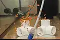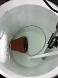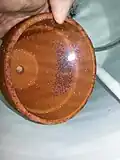 A newly laid clutch of about 250 eggs can be seen at the top of the inside of the clay pot. They are orange in color and capsule-shaped.