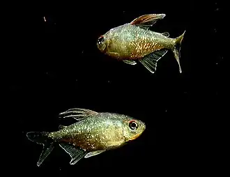 The diamond tetra, Moenkhausia pittieri, is a small freshwater tropical fish found in and around Lake Valencia in Venezuela. Males have much longer dorsal fins than the females and tend to be more brightly coloured, but both sexes are attractive fish and have become popular with aquarists. The dorsal and anal fins are purple and the body is silver. The eye is marked with red above the pupil, and a dark band runs along the midline of the body. Their common name comes from the bright, iridescent scales along the flanks. Maintenance in aquaria is similar to that of other tetras, although they will not do as well in hard, alkaline water as they do in soft, slightly acidic water filtered through peat.