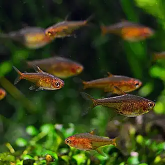 The ember tetra (Hyphessobrycon amandae) is a freshwater tropical fish native to the Araguaia River basin of Brazil. This species is of typical tetra shape, but grows to a maximum overall length of about 2 cm (0.7 in). Most exhibit striking orange and reddish coloration with mild translucency near their pelvic fins. Their eyes frequently mirror the color of the fish and are outlined in black. The fish's natural diet consist of small invertebrates and plants. Although somewhat hard to find in fish stores, H. amandae is commonly kept as an aquarium fish by hobbyists.