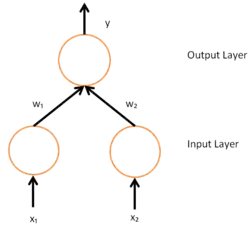 To understand the mathematical derivation of the backpropagation algorithm, it helps to first develop some intuition about the relationship between the actual output of a neuron and the correct output for a particular training example. Consider a simple neural network with two input units, one output unit and no hidden units, and in which each neuron uses a linear output (unlike most work on neural networks, in which mapping from inputs to outputs is non-linear)[g] that is the weighted sum of its input.
