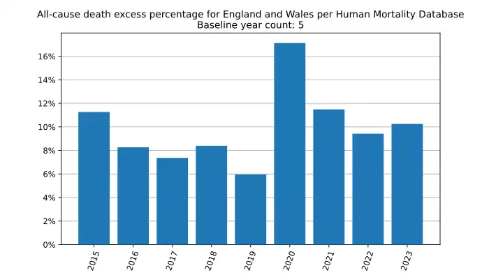 All-cause death excess percentage in England and Wales, year by year, based on mortality.org data, stmf.csv: