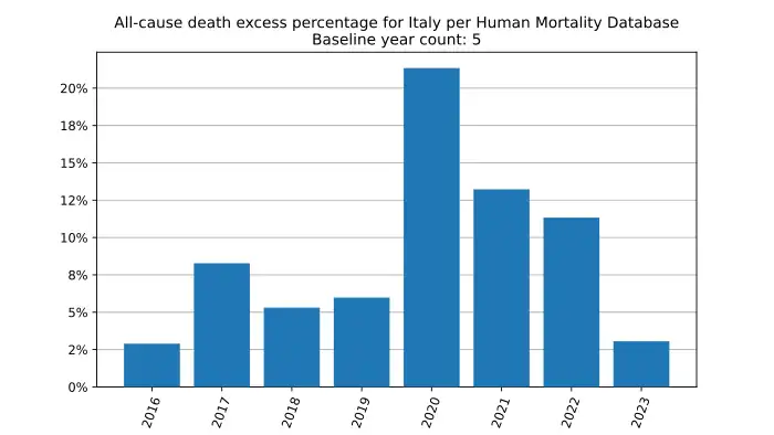 All-cause death excess percentage in Italy, year by year, based on mortality.org data, stmf.csv: