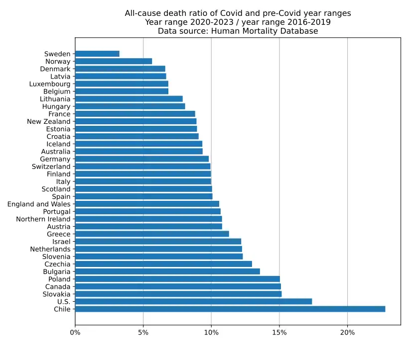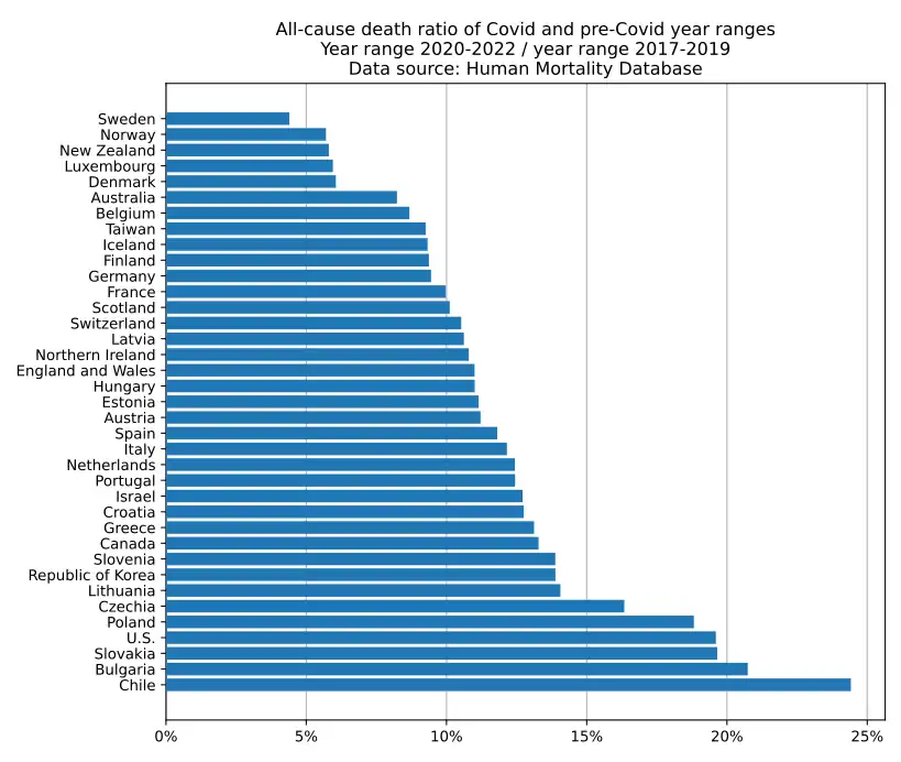 What follows are all-cause death charts for multiple countries, most of which were created from data from Human Mortality Database (HMD), mortality.org, a collaboration between organizations from Germany, the U.S., and France: Max Planck Institute for Demographic Research; University of California, Berkeley and INED, Paris. Some charts were created from other sources.