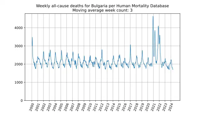 Weekly all-cause deaths in Bulgaria, based on mortality.org data, stmf.csv, 3-week moving average: