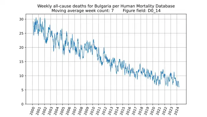 Weekly all-cause deaths in Bulgaria for 0-14 year olds, based on mortality.org data, stmf.csv, 7-week moving average:
