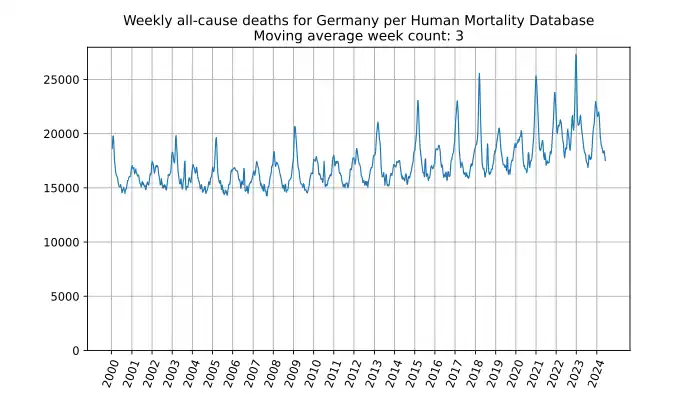 Weekly all-cause deaths in Germany based on mortality.org data, stmf.csv , 3-week moving average: