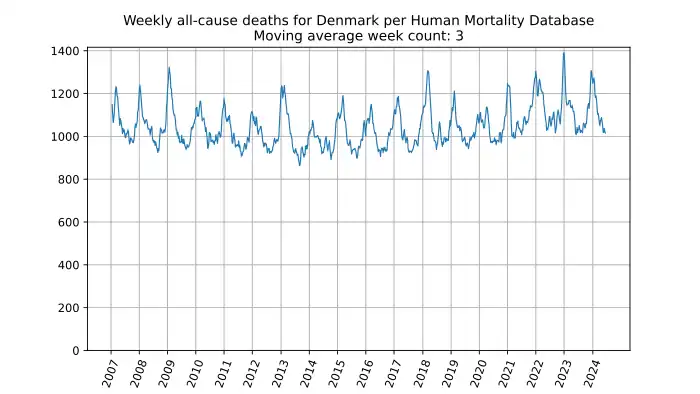 Weekly all-cause deaths in Denmark, based on mortality.org data, stmf.csv, 3-week moving average: