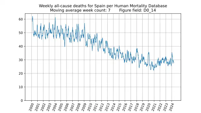Weekly all-cause deaths in Spain for 0-14 year olds, based on mortality.org data, stmf.csv, 7-week moving average: