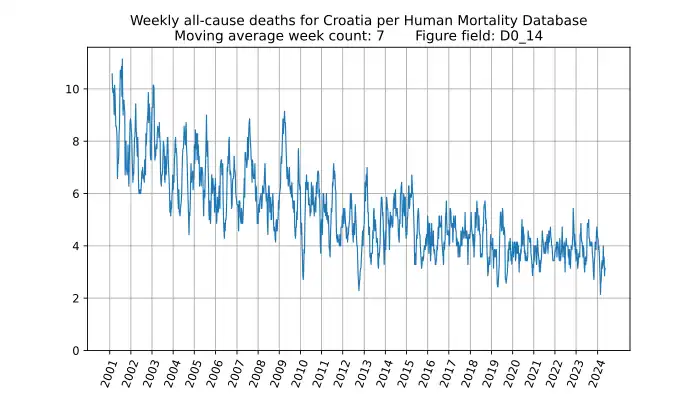 Weekly all-cause deaths in Croatia for 0-14 year olds, based on mortality.org data, stmf.csv, 7-week moving average: