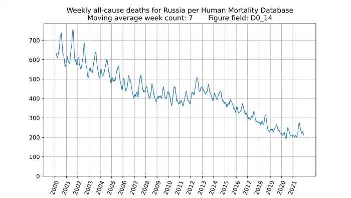 Weekly all-cause deaths in Russia based on mortality.org data, stmf.csv, 7-week average:
