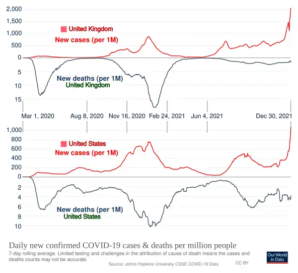 The first thing that caught my eye was the sudden shift in the relationship between cases and deaths starting at the end of 2021. Cases in both UK and US are surging dramatically, while deaths remain surprisingly constant.