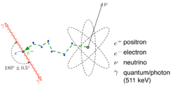 The figure at right shows a positron (e+) emitted from an atomic nucleus together with a neutrino (v). Subsequently, the positron moves randomly through the surrounding matter where it hits several different electrons (e-) until it finally loses enough energy that it interacts with a single electron. This process is called an "annihilation" and results in two diametrically emitted photons with a typical energy of 511 keV each. Under normal circumstances the photons are not emitted exactly diametrically (180 degrees). This is due to the remaining energy of the positron having conservation of momentum.