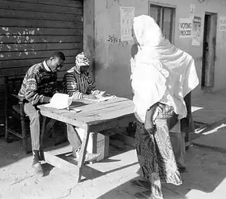 Politics: In 1989 two political parties established by government: National Republican Convention, slightly right of center, and Social Democratic Party, slightly left of center. Presidential elections scheduled for December 1992. File:Election in Nigeria 1999.jpg