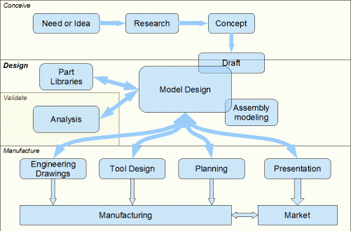 Major CAD/CAE/CAM software companies develop and sell tools that cover the whole cycle. These complex software tools support change management, teamwork, versioning and resource planning.