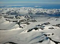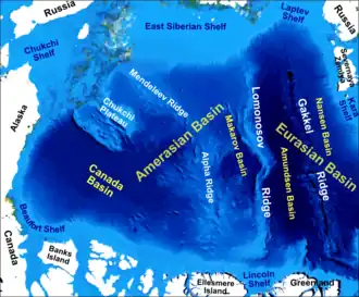 The Alpha Ridge is a major volcanic ridge under the Arctic Ocean between the Canada Basin (off Ellesmere Island) and the Lomonosov Ridge, active during the formation of the Amerasian Basin.[5] It was discovered in 1963. The highest elevation is about 2,700 m over the ocean floor. It is 200 to 450 km wide. The Alpha Ridge, Lomonosov Ridge, and Nansen-Gakkel Ridge are the three major ranges that divide the Arctic Ocean floor,[6] running generally parallel to each other.
