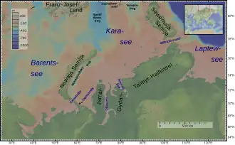 It is encompassed by the Kara Sea, Laptev Sea, and East Siberian Sea, and respectively subdivided into the Kara Shelf, the Laptev Shelf and the East Siberian Shelf.