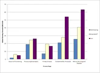 In the process implementation stage, the three alternatives received similar scores. This is because virgin materials such as steel and plastics are used in the manufacturing of the equipment. In the primary process operation phase wet and GreenEarth® cleaning scored higher than perc cleaning because perc is a toxic substance and the liquid waste formed during operation cannot be disposed of by regular means. The other two alternatives use non-toxic solvents and can be released into the drains.