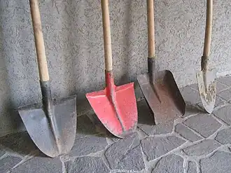 - shovel, ie., a hand tool with a handle, used for moving portions of material such as earth, snow, and grain from one place to another, with some forms also used for digging. Not to be confused with a spade, which is designed solely for small-scale digging and incidental tasks such as chopping of small roots. [8]