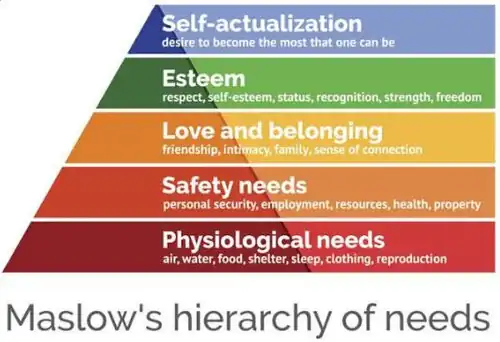 Eudaimonic wellbeing suggests that happiness is achieved through self-actualisation and through individuals finding life meaning (Disabato, Goodman, Kashdan, Short & Jarden, 2016).The concept of self-actualisation is a key component of Maslow's hierarchy of needs. Maslow's hierarchy of needs is a five tiered pyramid in which each level signifies a human need that must be achieved before moving up the tier (Maslow 1968).The theories origins lie within both the psychodynamic and humanistic perspective of psychology and places importance on the individual and the experiences they have in order to find meaning and purpose in their existence. The five levels include: