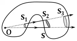 1) In this description of the flux element, (j=1,2,3) where is the outward unit normal, and a positive charge is assumed at point O, inside the Gaussian surface shown. The field lines exit at and but enter at . In this figure,