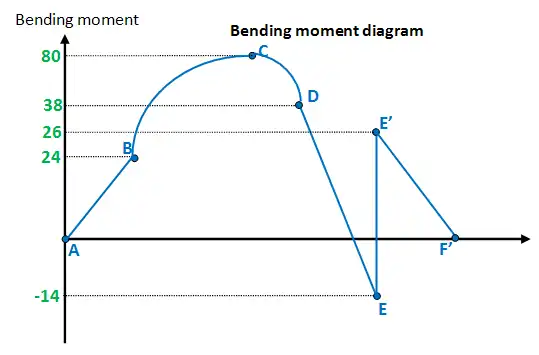Finally, plot the points on the bending moment diagram. Join all the points up, EXCEPT those that are under the uniformly distributed load (UDL), which are points B,C and D. As seen below, you need to draw a curve between these points. Unless requested, I will not explain why this happens.