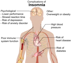 Studies have shown that both partial and complete sleep deprivation are associated with cognitive and psychological dysfunction which ultimately result in reduced academic performance. College students with more nights of insufficient sleep are more likely to exhibit feelings of hopelessness, loneliness, exhaustion, anxiety, and desire to self-harm. Additionally, students are more likely to feel overwhelmed and depressed if they have more nights of insufficient sleep.[4] Even students who manage to sleep 4-5 hours per night demonstrate significant mood dysfunction. A study in which subjects were limited to only 4.5 hours of sleep per night for week found that the participants were more stressed, angry, sad, and mentally exhausted compared to controls who slept for an adequate amount. Furthermore, the study found that after participants restored their normal sleep schedule, their mood improved dramatically. The results of this study suggest a possible causative link between insufficient sleep and depressed mood.[5] Further studies have shown that a sleep debt of just 2 hours per night is associated with greater depressive symptoms[2] and decreased GPA.[3]