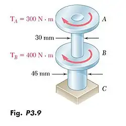 - In order to reduce the total mass of the assembly of Prob 3.9, a new design is being considered in which the diameter of shaft BC will be smaller. Determine the smallest diameter of shaft BC for which the maximum value of the shearing stress in the assembly will not increase.