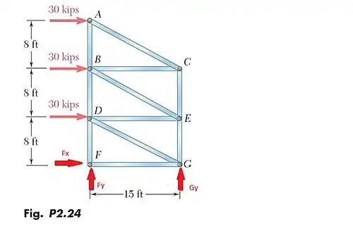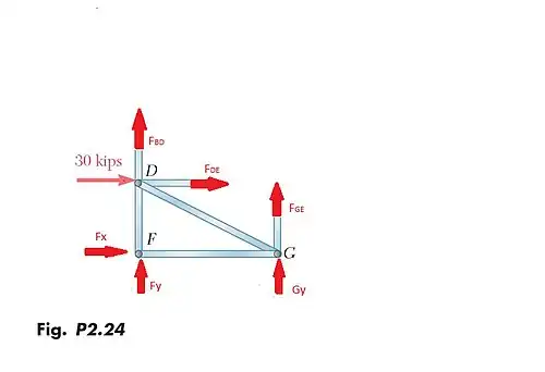 For the steel truss (E = 29 x 10^6 psi) and loading shown, determine the deformations of members BD and DE, knowing that their cross-sectional areas are 2 in^2 and 3 in^2, respectively.