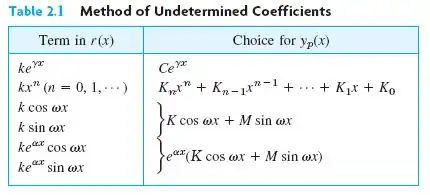 To find the particular solution of an ODE we can use the method of undetermined coefficients. In report 3 we used the table 2.1 below to find the standard form of the particular solution given the form of the excitation .