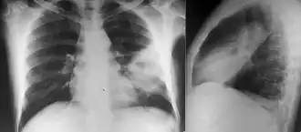 Diabetes mellitus is one of the most important risk factors in developing melioidosis. The disease should be considered in anyone who has spent time in endemic areas who develops a fever, pneumonia, or abscesses in their liver, spleen, prostate, or parotid gland.[1] The clinical manifestation of the disease can range from simple skin changes such as abscesses or ulcerations to severe organ problems.[7] The commonest organs affected are liver, spleen, lungs, prostate, and kidneys. Among the most common features are bacteremia (in 40 to 60% of cases), pneumonia (50%), and septic shock (20%).[1][8] People with only pneumonia may have a prominent cough with sputum and shortness of breath. However, those with septic shock together with pneumonia may have minimal coughing.[3] Results of a chest X-ray can range from diffuse nodular infiltrates in those with septic shock to progressive consolidation located most commonly in the upper lobes for those with pneumonia only. Pleural effusion and empyema are more common for melioidosis affecting lower lobes of the lungs.[3] In 10% of cases, people develop secondary pneumonia caused by other bacteria after the primary infection.[2] In northern Australia, 60% of the infected children presented with only skin lesions, while 20% presented with pneumonia.[2]
