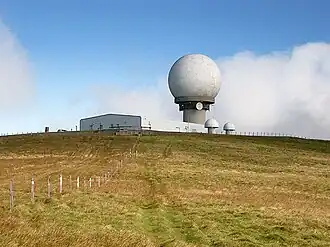- π Lowther Hills Radar Station is the giant golfball perched on a tee two miles south of Wanlockhead, as if waiting for Wotan to thwack it. It's an automated primary air traffic control station monitoring aircraft within 120 miles. It was installed in Sep 2022 and uses anti-clutter technology to screen out radar interference by wind turbines. That makes it possible to build wind farms on the Lowther Hills, previously unsafe with the earlier station on the busy transatlantic route.