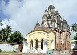 The Rajbari temple complex consists of several temples and other religious structures built over a period of more than a hundred years. It lies bang opposite the Nava Kailash complex. The complex houses two of the three 25-pinnacled temples of Kalna (incidentally there are a total of five 25-pinnacled temples in West Bengal). The complex is laid out with well manicured lawns crisscrossed with walkways. The lawns are laid out with flower beds and trimmed hedges.