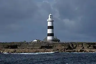 - Lighthouses: the first Inis Mór light was in the wrong place and you couldn't see it anyway. It still stands, but was replaced in 1857 by lighthouses on the Brannock Rocks just west of Inis Mór, and on Inis Oírr.
