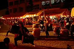 Taiko (太鼓) are Japanese drums. Taiko drums are unique to Japan, and range in size from small handheld drums to enormous 1.8-metre (71 in) stationary drums. Taiko also refers to the performance itself; these physically demanding instruments can be played solo or in a kumi-daiko ensemble, and are very common at festivals. (In Japanese, taiko just means "drum", but is usually understood to mean "Japanese drums" as it does in the rest of the world. A Western drum kit would be called doramu setto, doramu kitto, or doramusu.)