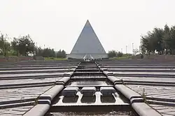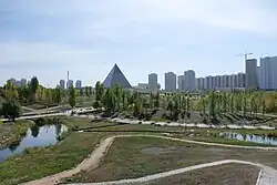 - 🌍 Palace of Peace and Reconciliation (Бейбітшілік пен келісім сарайы), Tauelsizdik Ave 57, ☏ +7 7172 74 47 44. daily 10:00-18:00. Completed in 2006 after a design by British architect Norman Foster, and also known as the "pyramid". The pyramid portion of the building is 62 m high and sits on a 15-m-high earth-covered block. All of this construction is above ground level. The building holds a summit of all religions of the world every 2–3 years. Though the landscaping of the park rises up to cover the lower levels, these are not in fact basements. This building offers a great view of the city, two art galleries, an archaeological and ethnographic museum, opera hall, and a cafe.